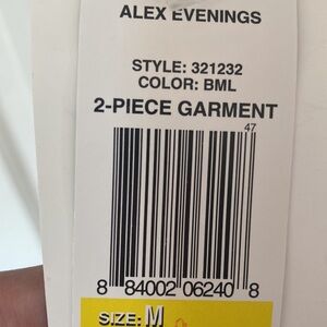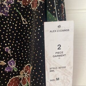 Gorgeous new with tag with no flaws Alex Evenings set. Black set features floral print with gold glitter accents. Fabric is 90% acetate and 10% spandex for a tailored fit. Blazer has shoulder pads (pictured). Great for a wedding or cocktail event. New with tags womens medium!