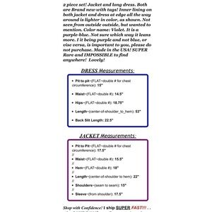 2 piece set! Jacket and long dress. Both are Brand new with tags! Inner lining on both jacket and dress at edge all the way around is lighter in color, as shown. Not seen from outside outside, but wanted to mention. Color name: Violet. It is a purple-blue. Not sure which way it leans more. If it being purple and not blue, or vise versa, is important to you, please do not purchase. Made in the USA! SUPER Rare and IMPOSSIBLE to find anywhere! Lovely!