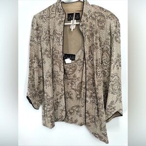 Elegant Armani Exchange blazer and top set with a paisley pattern. Features a mix of beige and black colors.