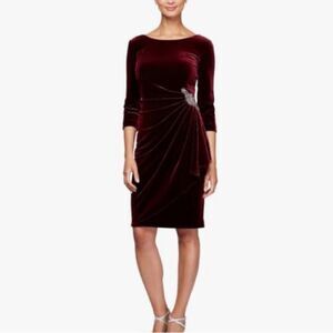 Alex Evenings Women’s Cranberry Velvet 3/4 Sleeve Dress, Size 14, NWT New with tags Size 14 Ready for an effortless evening out? This stunning cocktail dress has a luxurious and rich velvet fabrication and the perfect amount of shine to catch anyone's eye! Side ruching Side beading/embellishment Scoop back