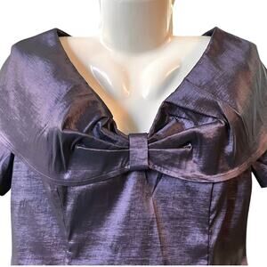 The two-piece dress is made from deep, shimmery purple fabric. The top has short sleeves, a distinctive neckline with a large bow at the center, and a back zipper closure. The A-line knee-length skirt features a slight fit-and-flare shape and a back zipper/clasp closure.