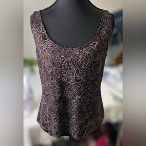 Alex Evenings women's twinset featuring a mandarin collar jacket and a matching top, a tank top, in a purple and gold swirling pattern.