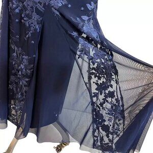 Alex Evenings dress Long Fit and Flare Dress Godet Detail, navy blue with gorgeous floral embroidery, almost trumpet style skirt but light and flowy,