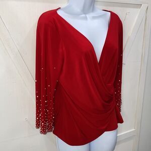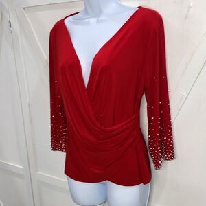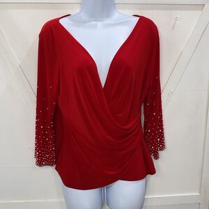 Alex Evenings 3/4 Sleeve Embellished Red Faux Wrap V-Neck Blouse Size Medium