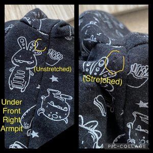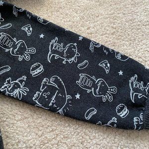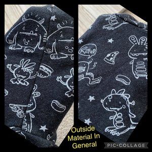 All over dinosaur and monster graphic print. Also features food like pizza, hamburgers, fries, hot dogs & stars, skateboards, and “RAWR” quote from one of the dinosaurs on graphic print.