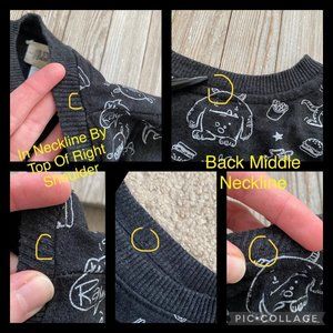 A couple small holes in neckline: 1 by top of right shoulder (Pic #10, left top & bottom pics) and 1 in back middle (Pic #10, top right pic and bottom middle & right pics).
