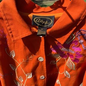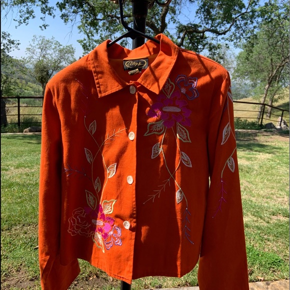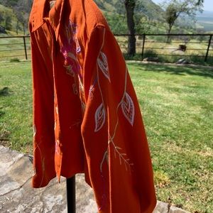 100%cotton, fully lined, embroidery accents on front, both sleeves and right back. Vibrant orange.