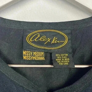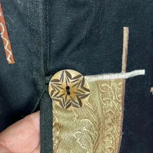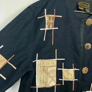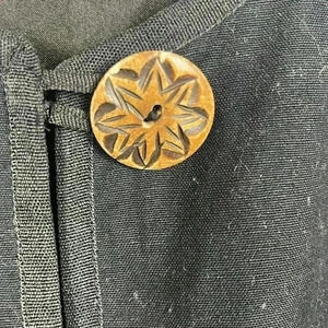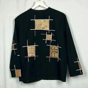 Alex Kim Womens Top Missy Black Gold Beige M Tic Tac Toe Pattern Wooden Buttons Boxy Fit Long Sleeves Unique Classy Versatile EUC
