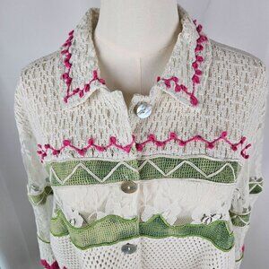 Alex Kim XL White Lace Embroidered Button Cardigan Pink Green Boho