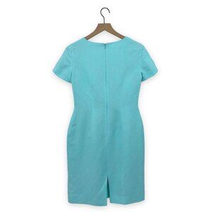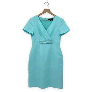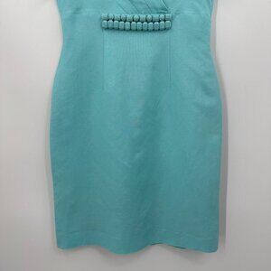 Blue linen blend, lined, beaded accent, short sleeve, back hem slit, back zip closure, sheath dress.