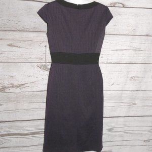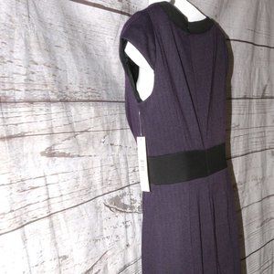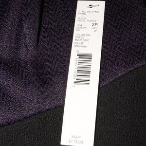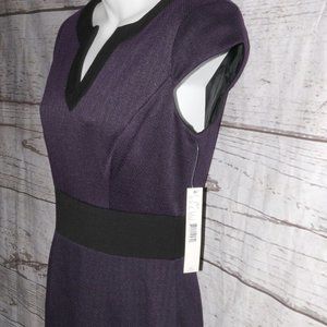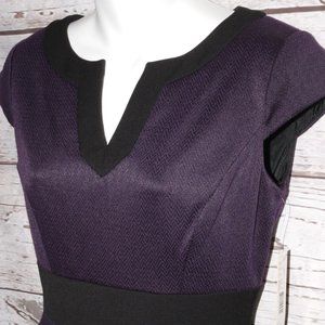Alex Marie Black/Royal purple (I would call it similar to eggplant) name is majestic nights, short sleeve dress in size 2 petite, NWT. Has black inner lining and hidden back zipper. Contrasting black fabric at waist and neckline, slight V-neckline and back slit. Has a small chevron type pattern when viewed up close (see photo #6 for detail) Approx measure: 37.5" shoulder-hem/16" pit-pit/15" shoulder-shoulder Very classy, perfect for work or the office and even date night. Perfect for Fall paired with a jacket!