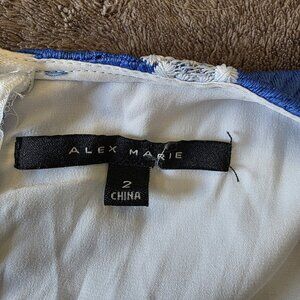 Beautiful Alex Marie sheath dress in a vibrant royal blue floral lace overlay with white underlay. Perfect for weddings, parties, or special events. Excellent pre-owned condition with no flaws noted.