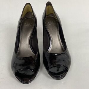 Alex Marie Cashmere Pansy Grey Patent Leather Stiletto Peep Toe Heel Pumps