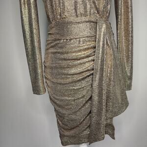 Beautiful, shimmery gold metallic Chrissy cocktail party dress from Alex Marie. Long sleeves. Ruched along one side with a draped detail at the waist. Fabric has stretch. 94% polyester 6% elastine