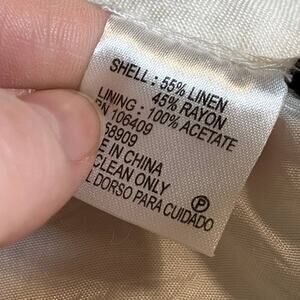 In good used condition. I got many stains out of these, and I believe I got them all. I don't quite understand why the lining hangs down below the pants. These could be cuffed or cut off or whatever. Linen Rayon Blend. Lining is acetate. Size 6P.