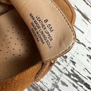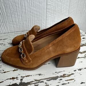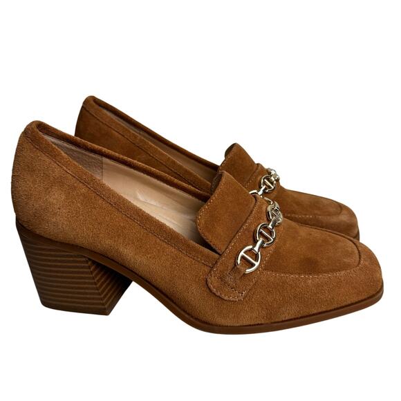 Stylish tan heeled loafers by Alex Marie. Features a chic chain detail. Perfect for any occasion.
