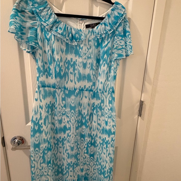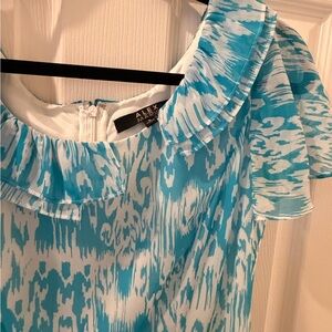 Alex Marie one-shoulder dress with a ruffle neckline. Turquoise and white ikat-inspired print. Feminine flutter sleeve and fitted waist seam. Lightweight, breezy fabric ideal for warm weather events.