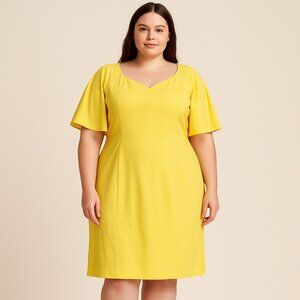 alex marie yellow dress, flutter sleeve dress, sheath dress size 16, yellow spring dress, easter dress, wedding guest dress plus size, alex marie midi dress, bright yellow cocktail dress, elegant workwear dress, women’s yellow formal dress