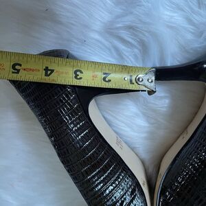 Alex Marie brown leather reptile prints 3”heels slip on shoes with gold tone accent pre owned in good used condition normal wear small scratch the right heel some peelings on the inside of the shoes see all pictures any questions please message
