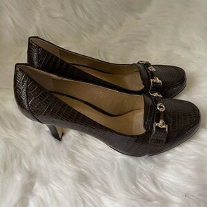 Alex Marie brown leather reptile prints 3”heels slip on with gold tone accent