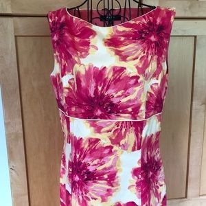 Alex Marie sleeveless, pink/yellow/cream, full lined sheath dress with side zipper and bra clasps.