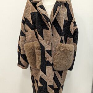 Two coats in one. taupe/black print side with puffy taupe pockets and plain taupe with black print accents on bottom, collar, pockets and down front button area. Fun, warm coat!