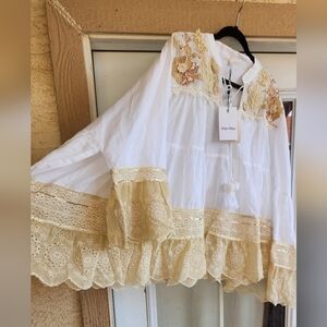 100% cotton hand embroidery. Very comfortable and pretty. Roomy and light.