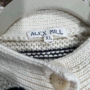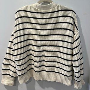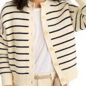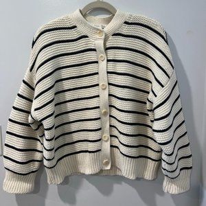 Stylish cream cardigan with black stripes. Features button-up front. Perfect for layering.