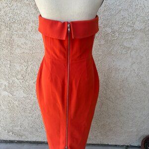 Alex Perry Audra Dress Strapless Bodice-Overlay Midi Dress Size 14 in good condition fitted midi dress with slit and iconic Alex Perry Full back Zipper dress has minor stains needs to be dry cleaned not sure if they are permanent used once for a cocktail party see all detailed photos retailed for $1300 see designers page for sizing guidelines