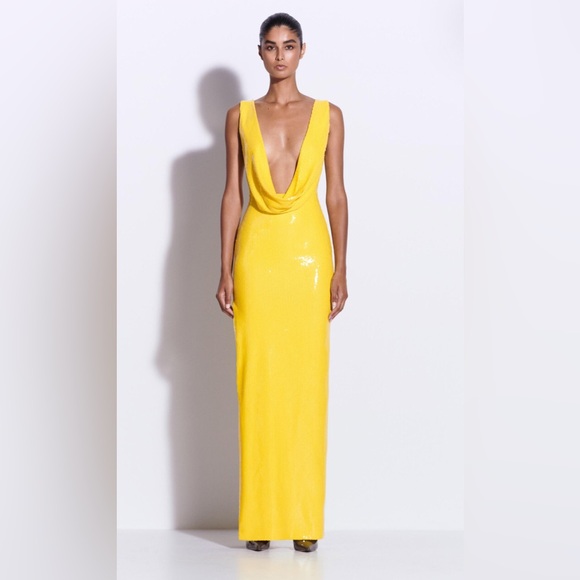 Alex Perry Cowl Neck Sequin Embellished Gown in Yellow