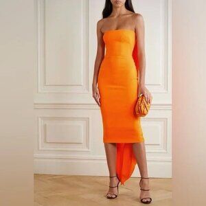 Alex Perry Hall Orange Strapless Crepe Cocktail Midi Dress Draped Gown