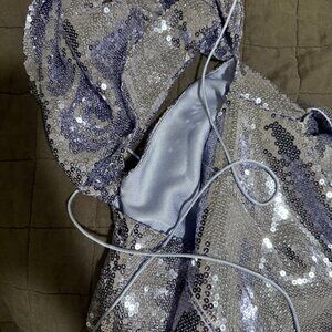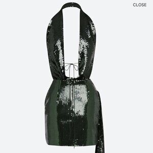 Lightweight mesh sequin mini dress with a draped halter neckline, open back, and asymmetric wrap skirt. Elegant and modern design, suitable for parties and evening events.