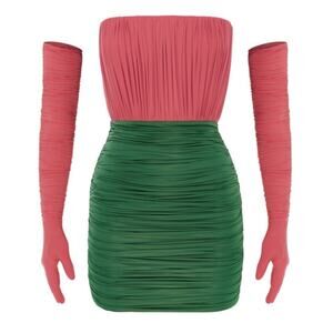 Alex Perry Ruched Strapless Jersey Pink and Green Mini Dress with Gloves Size 6