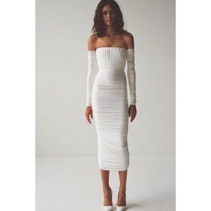 Alex Perry Sterling Ruched Long Sleeve Off Shoulder Dress White