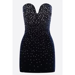 Mini dress in velvet featuring a strapless sweetheart neckline and crystals studded over the bodice and onto the skirt.