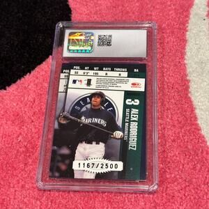 This is the 1998 Leaf Rookies & Stars Ticket Masters Die-Cut featuring Alex Rodriguez and Ken Griffey Jr., graded CSG 8. A dual-star insert showcasing two of the biggest names of the era. Die-cut design, strong surface shine, and classic late-90s Leaf styling. Card and slab shown exactly as pictured—please review photos for condition.