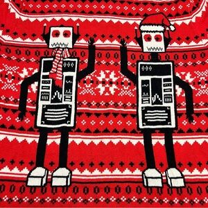 Alex Stevens sweater, ugly Christmas sweater, holiday sweater, robot sweater, novelty sweater, geeky Christmas sweater, red holiday sweater, Christmas party outfit, Santa sweater, Fair Isle sweater, Christmas jumper, winter sweater, festive sweater, holiday knitwear, quirky sweater, Alex Stevens holiday