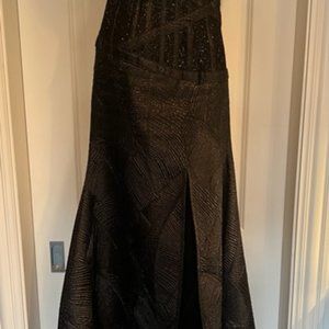 This was worn once in September of 2021 by the mother of the groom. Size 0. Was professionally tailored. Black material with cross detail. Sparkle on top and black textured pattern on the bottom. Strapless full length formal gown. Absolutely beautiful. No tears, stains or problems of any sort. As you can see in the pictures, the back forms a small train. This was ~$4,000 new.