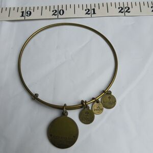 Gold bangle bracelet with multiple charms. Features a 'Because I Love You' charm. Alex and Ani 2014 gold colored charm bracelet, adjustable, collection, made in USA, pretty piece for day out or gift as a lovely gift