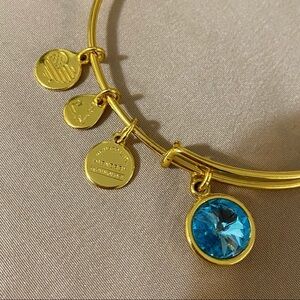 This beautiful Alex and Ani Blue Zircon Birthstone Charm Bangle is in excellent preowned condition. Size is shown in the listing but it can expand slightly. It is a gold tone metal they call “shiny gold” with minimal scratches to it. It has 4 charms including the blue zircon birthstone.
