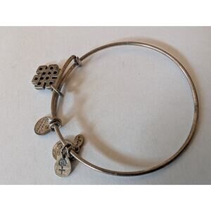 This Alex and Ani expandable bangle bracelet features a distinctive Endless Knot charm, symbolizing eternal harmony and interconnectedness. Crafted from silver tone metal, the bracelet boasts a vintage-inspired oxidized finish that highlights the intricate design of the charm and accompanying signature Alex and Ani tags. The expandable wire bangle design offers adjustable sizing to comfortably fit most wrists.
