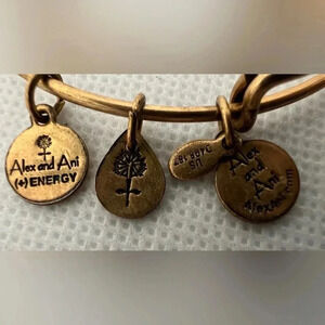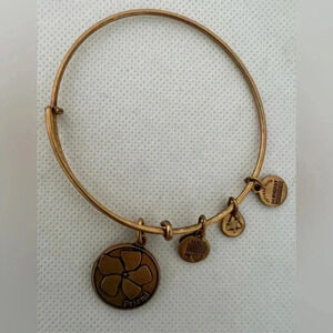 Womens Alex and Ani expandable wire bangle. Gold metal Friend charm.. The charm has a flower on it.