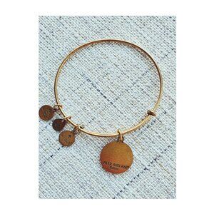 Add meaning and style to your stack with this Alex and Ani Rafaelian Gold Saint Christopher charm bangle. Features a detailed Saint Christopher medallion — the patron saint of travelers — on a signature adjustable wire bangle. Gold-tone finish with vintage-inspired design. Gently worn and in great condition.