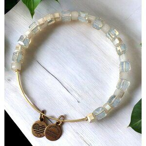Alex and Ani beaded charm bangle on a gold wire bangle with two logo charms. Beautiful translucent clear crystal beads, alternating with pearlized cream beads. Adjustable fit. Very good preowned condition.
