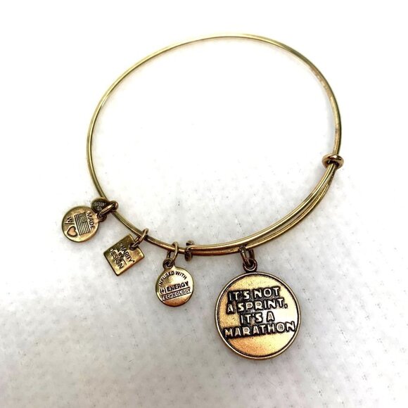 One gold Alex and Ani charm bracelet with one large charm which reads, It's Not A Sprint It's A Marathon, and three small charms. Expands from 2.0”- 3.5” to fit most wrists.