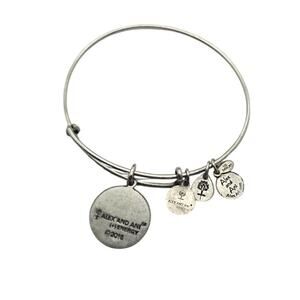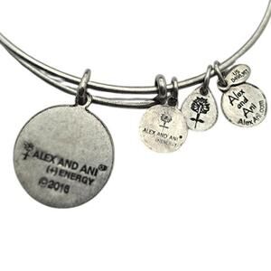 Show off your personal style with this dainty and meaningful Alex and Ani adjustable wire bangle featuring a raised “J” initial charm in a bold script font. The bracelet has a Rafaelian silver finish with the signature Alex and Ani charm cluster, including the “Infused With (+) Energy” tag.