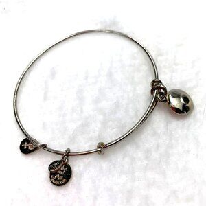 One silver Alex and Ani charm bracelet with one large Light Siam July Birthstone charm and three small charms. Expands from 2.0”- 3.5” to fit most wrists.