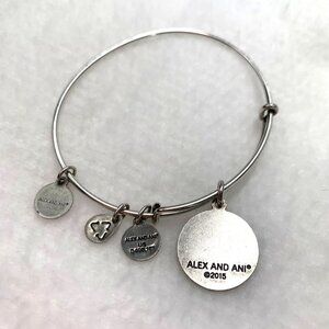 One silver Alex and Ani charm bracelet with one large Path of Life charm and three small charms. Expands from 2.0”- 3.5” to fit most wrists.