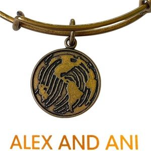 Alex and Ani expandable bangle bracelet in Rafaellian gold with world/globe charm.