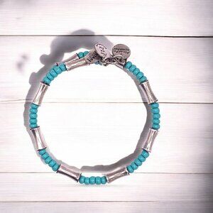 Stacked or solo, this silver and blue beaded Charm Bangle by Alex and Ani adds the perfect personalized flair to any outfit. Turquoise blue beads alternate with silver tube beads on this silver tone bangle with three small charm and three small silver dangle charms. Wrap style bracelet expands to fit most wrists. Excellent preowned condition.